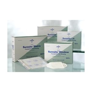 Product Description : Size: 4x4.5 inches 1 eachFeatures of the Medline Suresite Transparent Film Dressing: Protect the skin, I.V. sites and surgical incisions using Suresite? Transparent Film. Conforms to hard-to-dress areas, allows constant observation, and can be left in place for up to seven days. Suresite? is waterproof and is also bacteria-resistant. Latex-free. The product referenced on this detail page is sold be 50/bx.